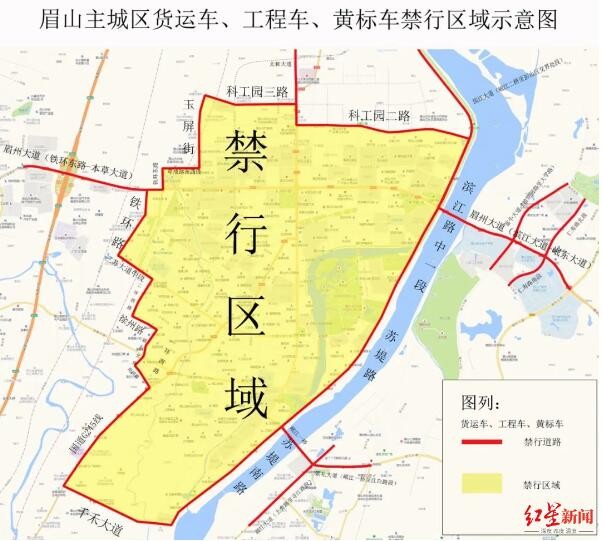 禁止通行区域里,主城区为:苏堤南路—千禾大道—国道245线—一环西路—湖州路—颖州南路—颖州北路—徐州路—二环西路—三苏大道—铁环路—眉州大道—铁环东路北段—阜成路西四段—玉屏街—科工园三路—东坡大道—科工园二路—滨江大道—滨江路中一段—苏堤路构成的封闭区域内所有道路(含以上道路)。