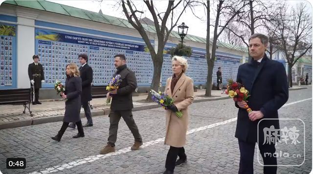 昨天泽连斯基与加拿大总理特鲁多、意大利总理梅洛妮、欧盟主席冯德莱恩、比利时首相德克罗一起向纪念墙上逝去的英雄们献花。