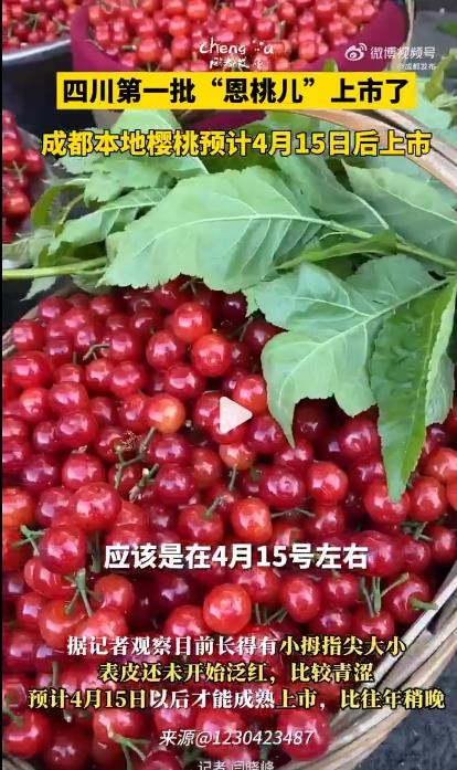 【红了!#成都本地恩桃儿预计下月上市#】“叫桃不是桃,穿着小红袄,春果第一枝,浑身都是宝”,说的就是——樱桃。哦,不!是叫“恩桃儿”。眼下,又到一年四川樱桃陆续成熟的季节。由于地理位置、气候条件等多方面因素,攀枝花市的樱桃可谓四川省内最早上市的“恩桃儿”。据了解,目前攀枝花部分地区的樱桃已经成熟上市,而成都本地樱桃预计4月15日后上市,你期待吗?