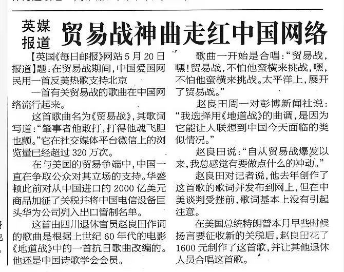 2019年,有美国、俄罗斯、新加坡等十七个国家的电视台、报刊、网站报道了其创作的《贸易战》等作品。至今网站、微信、抖音、快手等传媒上还能收看到《贸易战》《三大纪律八项注意》(防疫战歌)《致台军兄弟书》《当我还能发出光和热的时候》等相关作品的报道和演唱、朗诵视频。