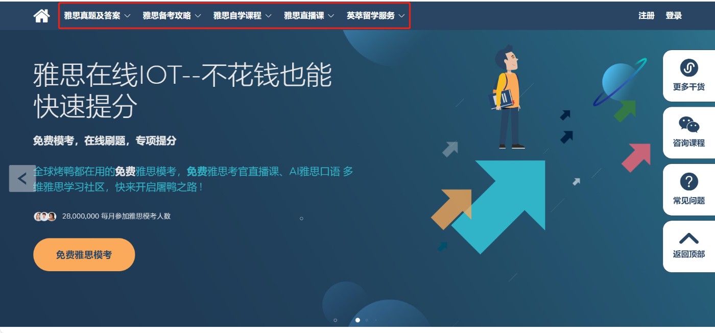 但它的学习性没有其他网站那么强,雅思官网更侧重于报名、备考指南、部分真题、模拟测试等内容,且有雅思相关的新鲜及时的资讯,能帮助咱们同学在准备考试前,对雅思的流程、用途,包括部分院校等,都能有一个较为全面的了解。