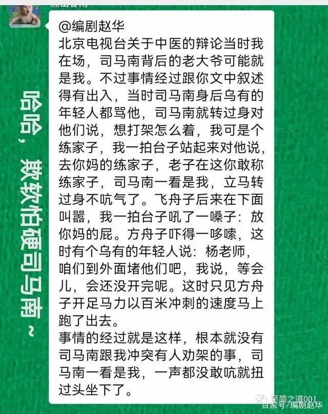 司马南转过身对我们说:“想打架怎么着?我可是个练家子(习武者)。”我们针锋相对的反驳,打就打呗,当时,老杨也在场,他一拍台子站起来对他说:“去你妈的练家子!老子在这你敢称练家子?”司马南一看是老杨,立马转过身不吭气了。