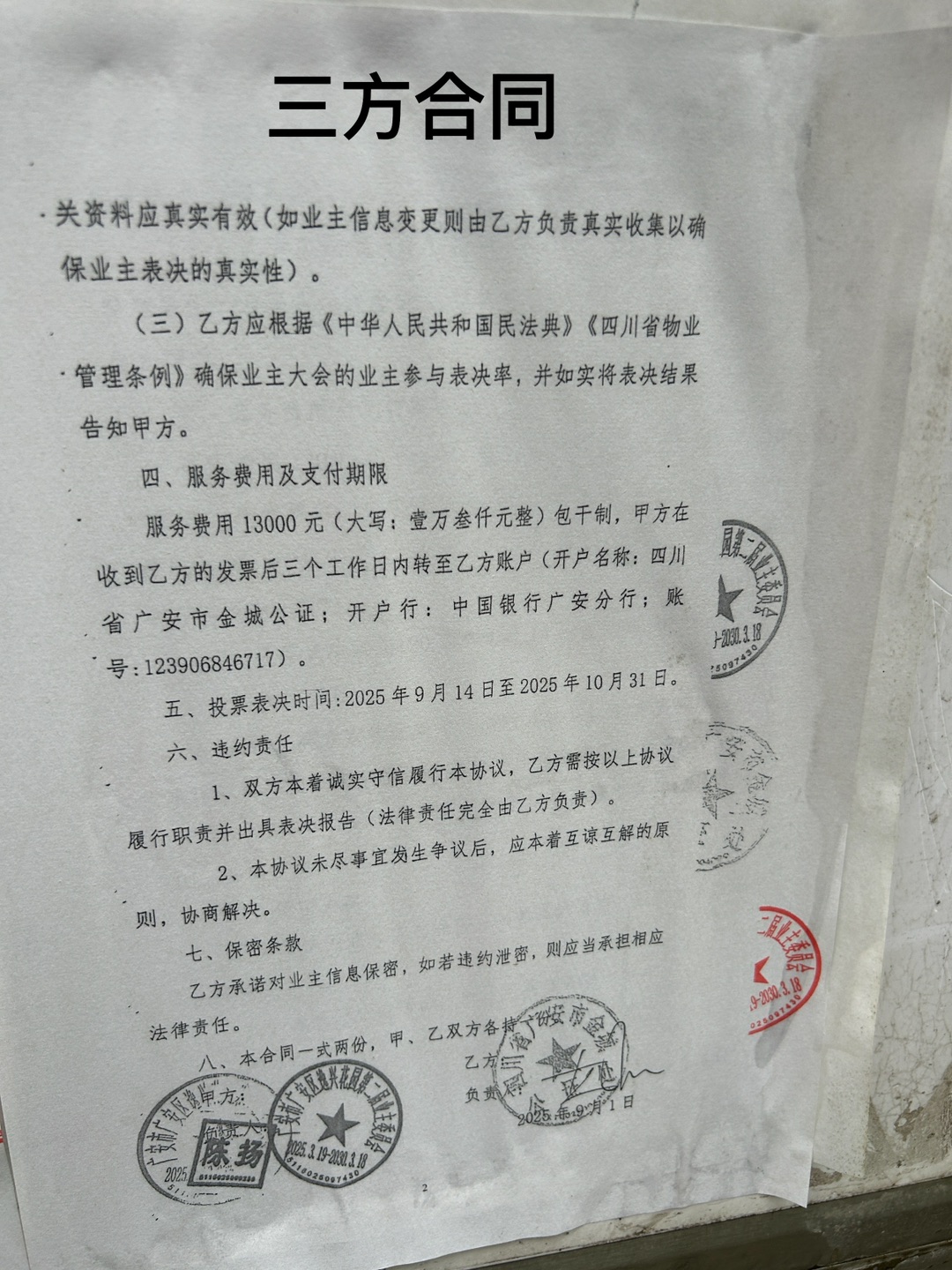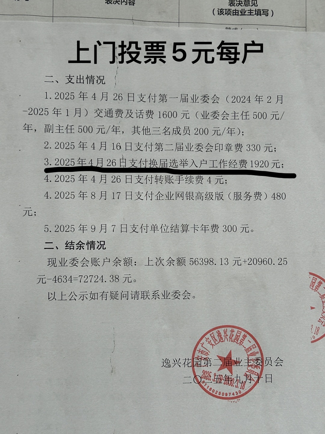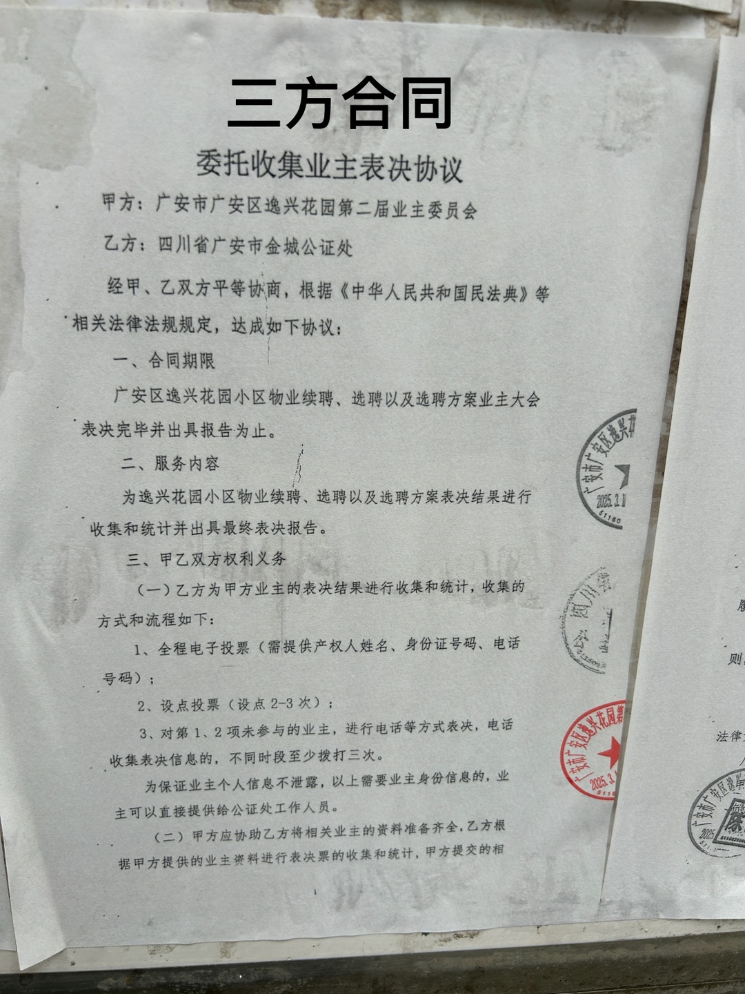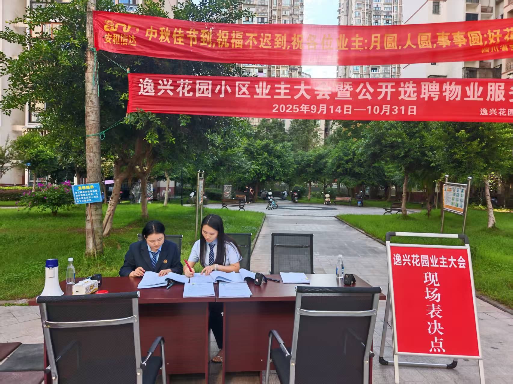 4.关于物业选聘的问题。经了解,逸兴花园物业服务合同于2025年8月期满,第二届业主委员于2025年6月8日组织召开物业选聘大会,因投票小组人员无人报名,导致业主大会未达到法定的要求,会议失败。经第二届业主委员会研究,决定重新启动召开物业选聘大会,并拟委托第三方机构协助开展投票工作,且在小区进行了公示,公示期间未收到业主异议,并与第三方机构签订服务协议,工作经费13000元,目前第三方机构正在协助组织召开物业选聘大会。