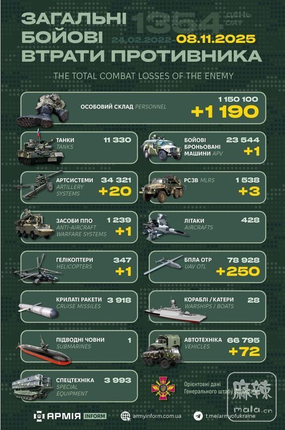 乌总参公布的昨日战果,歼敌(毙+伤)1190人。