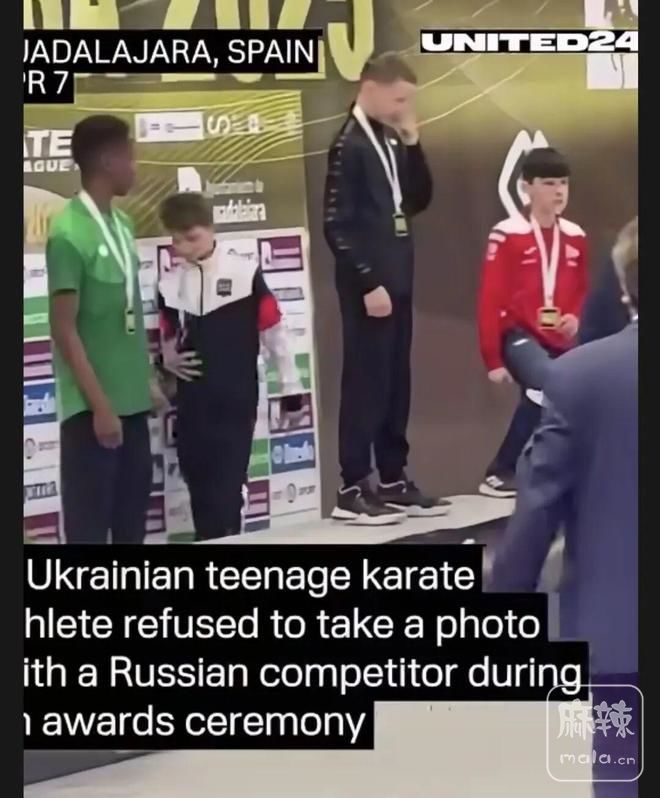 乌克兰空手道运动员拒绝与以“中立身份"参赛的俄罗斯选手在颁奖台上合影。