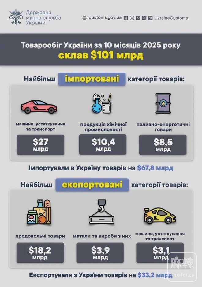 根据乌克兰国家海关局发布的数据,2025年1月至10月,乌克兰进口商品总额为678亿美元,出口总额为332亿美元。