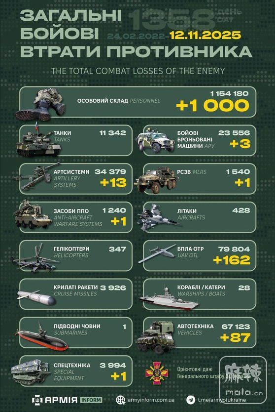 乌总参公布的昨日战果,歼敌(毙+伤)1000人。