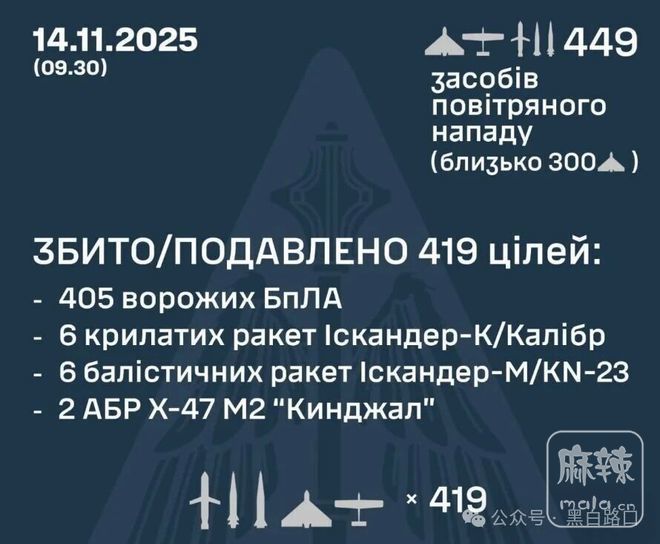 1、【乌克兰对俄罗斯袭击做出公正回应】11月14日,俄罗斯发射430架无人机、19枚导弹袭击乌克兰多地,乌军击落405架无人机、14枚导弹,袭击至少造成4死26伤,数十栋居民公寓、民用设施受损。