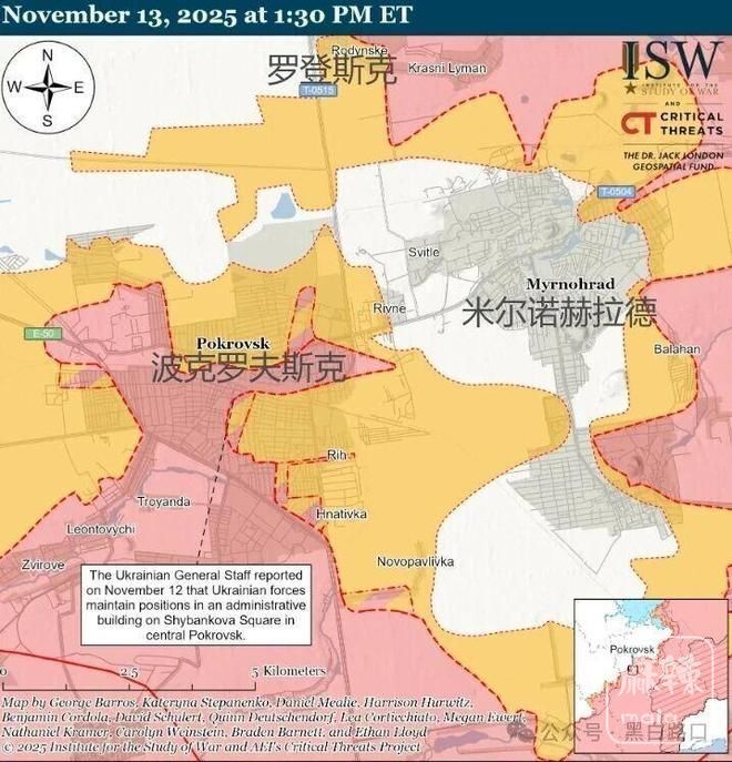 波克罗夫斯克方向,战争研究所(ISW)地图显示,俄罗斯控制波克罗夫斯克市近一半(46%),剩余地区是乌军控制或发生交战、渗透区域。
