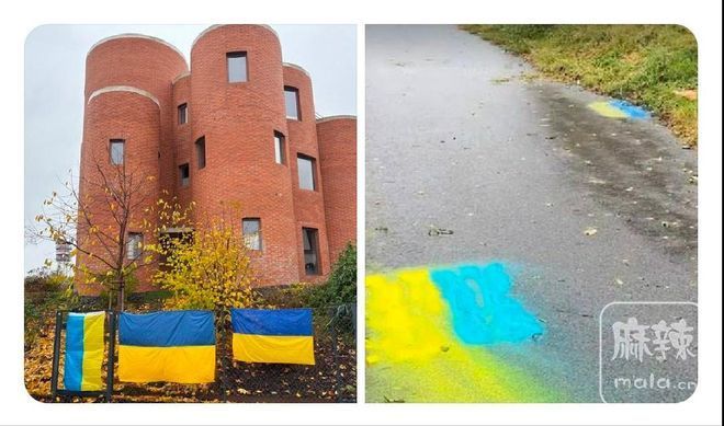 在捷克议会发言人富夫·冈村——就是下令移除议会大楼的乌克兰国旗的那位——的住宅周围,被人挂上了蓝黄旗(乌克兰国旗)。