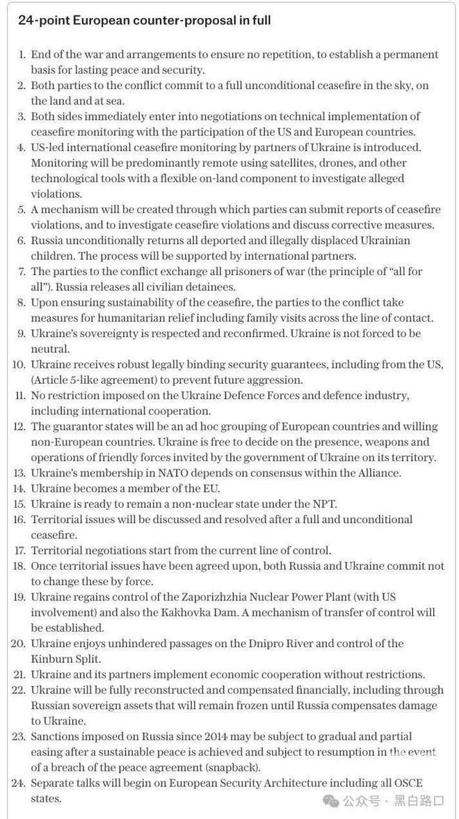 《每日电讯报》的“24点”和路透社的反提案全文需要对比看,目前“24点”对乌克兰有利,路透社的反提案全文纯粹是讨好特朗普的计划。