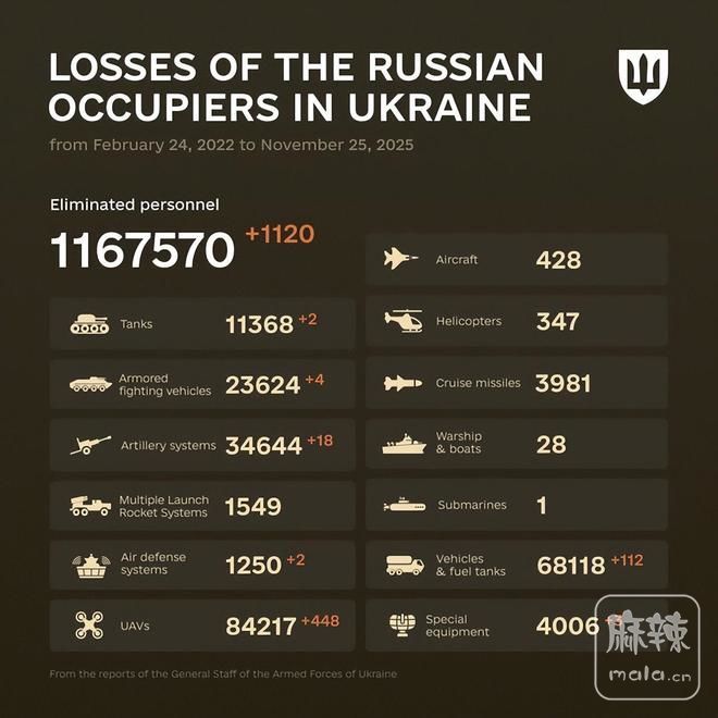 乌总参公布的昨日战果,歼敌(毙+伤)1120人。