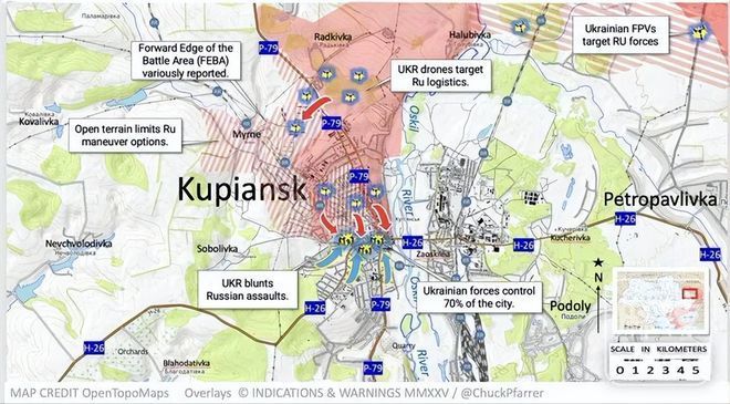 库皮扬斯克方向,乌军继续在市区小幅反攻。这座11月中旬就被俄罗斯总参谋部首长瓦列里·格拉西莫夫宣布占领,并向普京总统汇报这一“战果”的小城,目前大约有30%区域控制在渗透入城的俄军手里,且主要集中在两处狭窄地带。