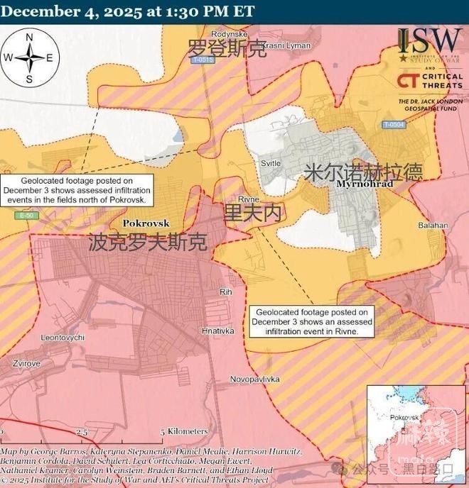 波克罗夫斯克方向,战争研究所(ISW)最新地图展示波克罗夫斯克-米尔诺赫拉德仍有乌军驻守。