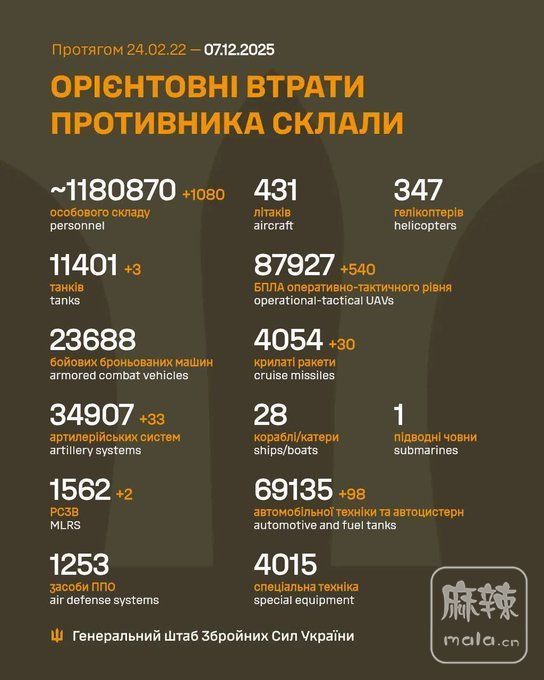 2025年12月7日,俄乌战争进入第1382天。
