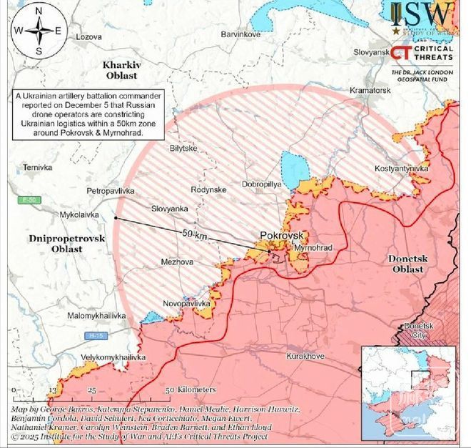 此外,根据战争研究所的说法,俄罗斯军队正试图利用无人机在50公里范围内拦截乌克兰的补给线,从而完全切断乌克兰在波克罗夫斯克方向的战术和作战级后勤保障。