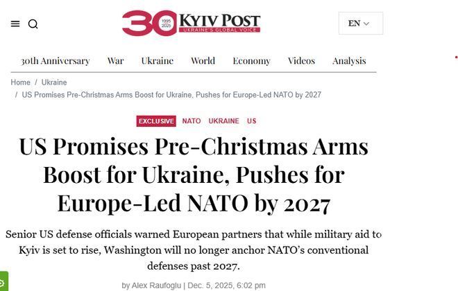 《基辅邮报》报道:“美国将在圣诞节前大幅增加对乌克兰的武器供应,但与此同时,欧洲正在为2027年后的北约(没有华盛顿)做准备。”