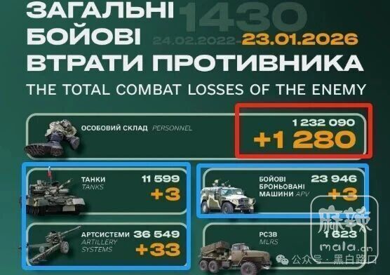 俄乌战争第1430天(2026年1月23日),过去24小时大事件概述如下