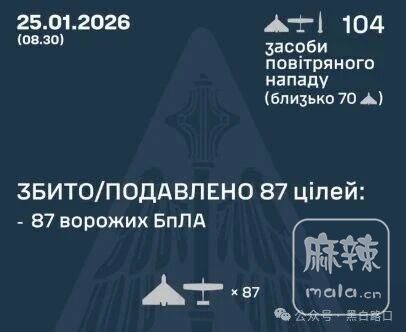 1月25日,俄罗斯发射102架无人机、2枚导弹袭击乌克兰,乌军击落87架无人机,10个地点记录到撞击。