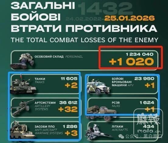 俄乌战争第1432天(2026年1月25日),过去24小时大事件概述如下: