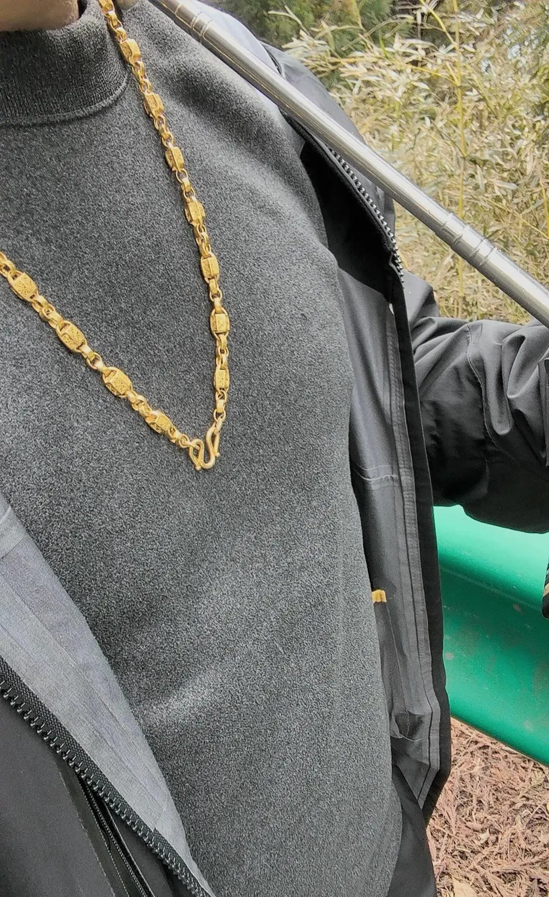 他说,这块金牌重80余克,是2024年4月份买的,发票都还在,平时他都一直戴着,出去游玩时也会随身戴在脖子上。