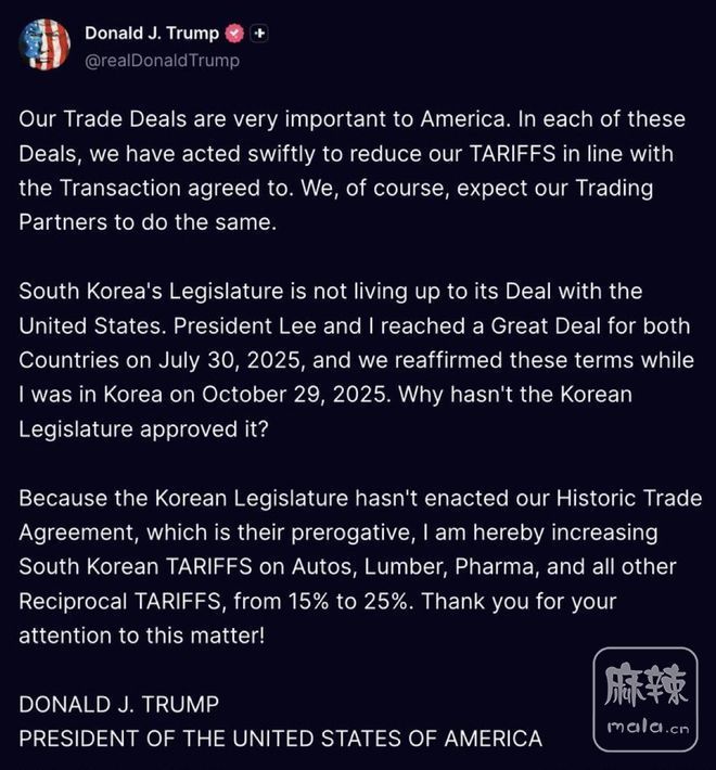 “我们的贸易协议对美国非常重要。在这些协议中的每一项里,我们都迅速采取行动,按照已达成的交易内容降低了我们的关税。当然,我们也期望我们的贸易伙伴采取同样的行动。然而,韩国国会并未履行其与美国达成的协议。李总统和我于2025年7月30日为两国达成了一项伟大的协议,并且我在2025年10月29日访问韩国期间再次确认了这些条款。那么,为什么韩国国会至今尚未批准该协议?由于韩国国会尚未通过我们这项具有历史意义的贸易协定——这当然是他们的权力——我在此宣布,将提高对韩国的关税,包括汽车、木材、制药产品以及所有其他对等关税,税率从15%提高至25%”。