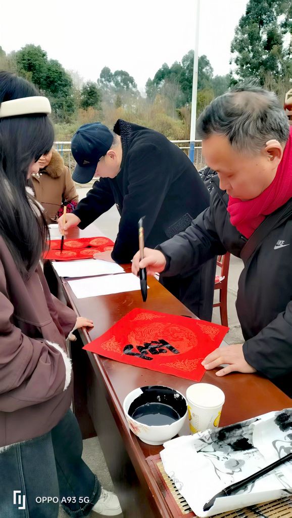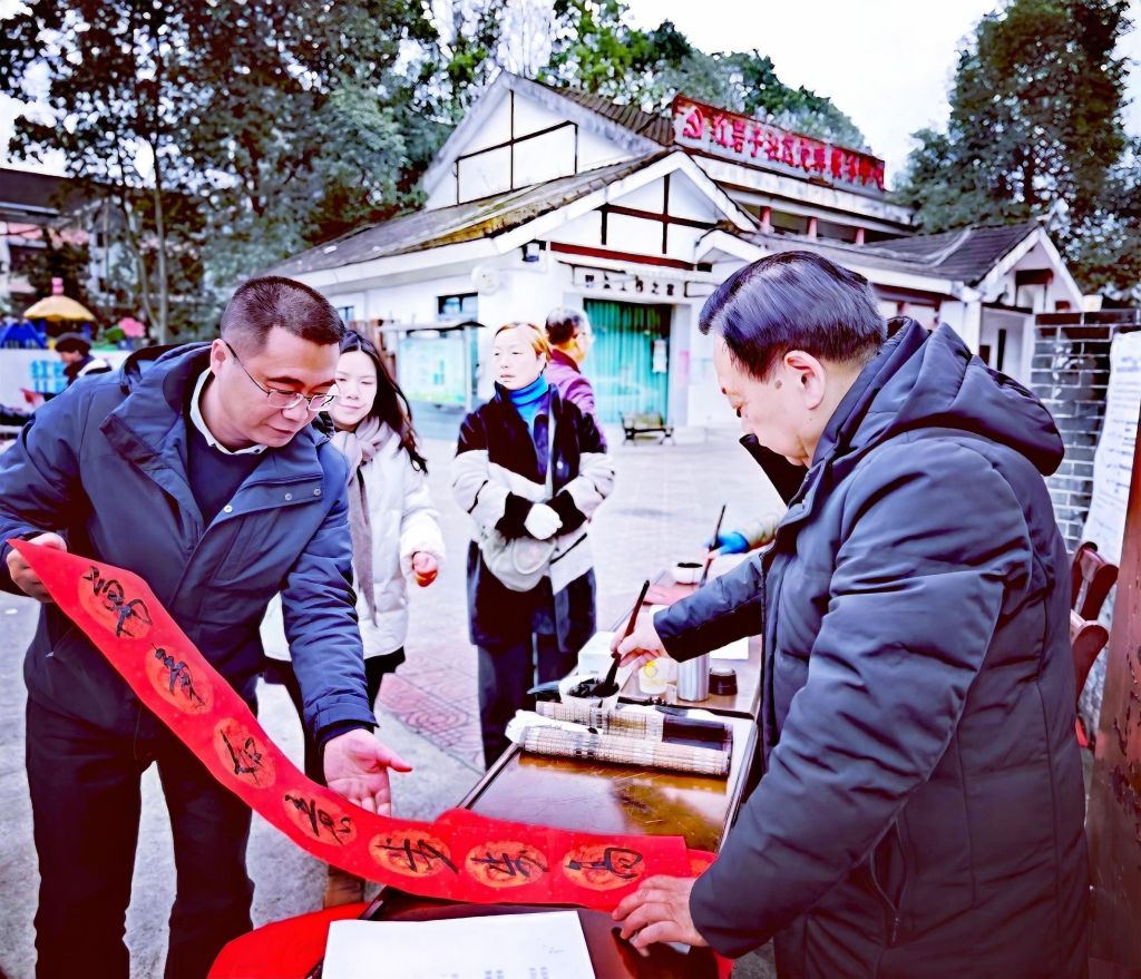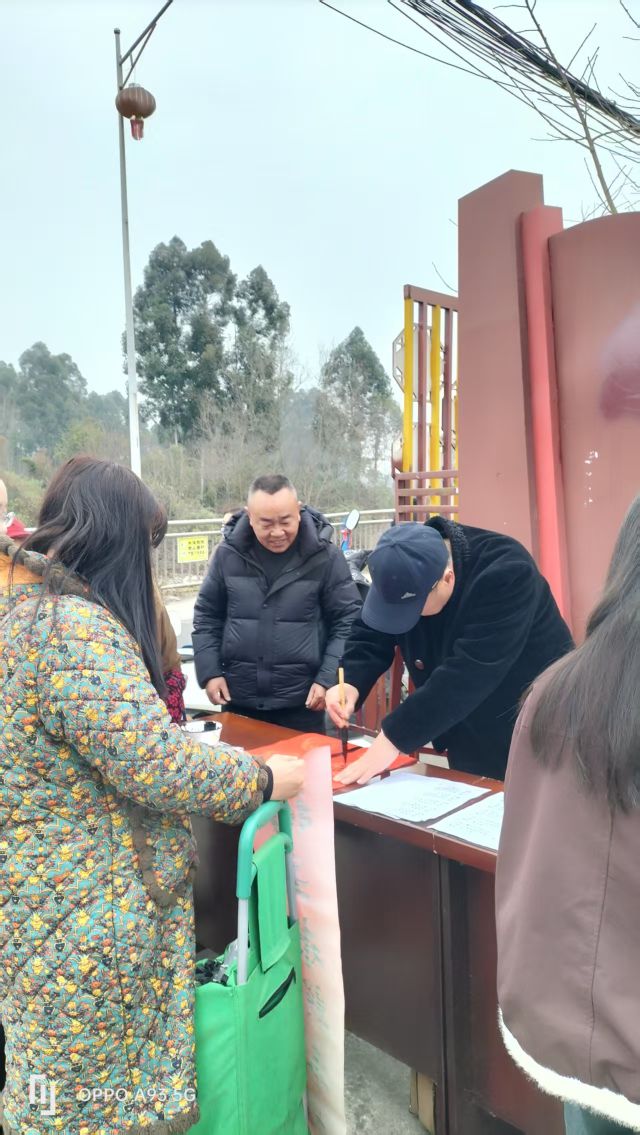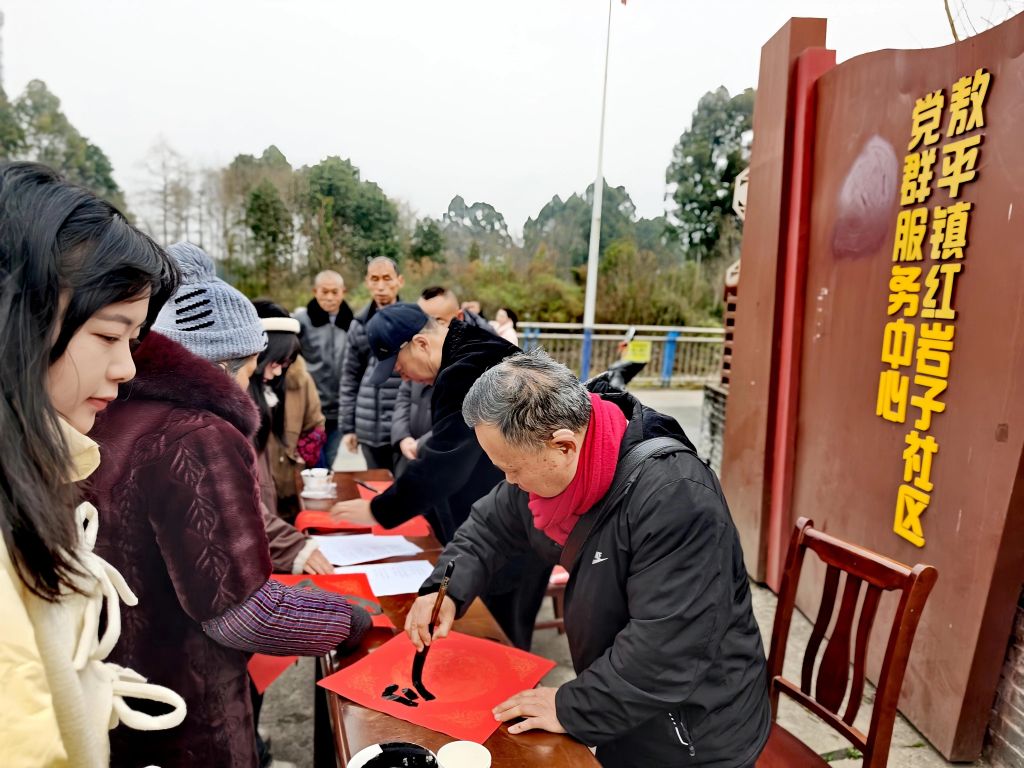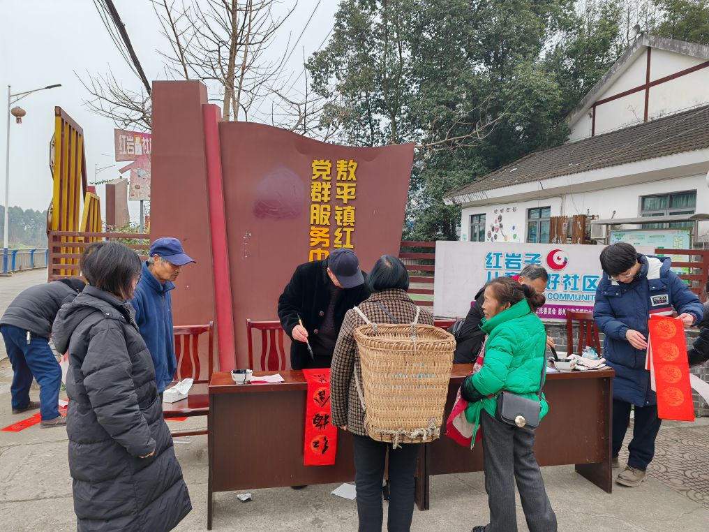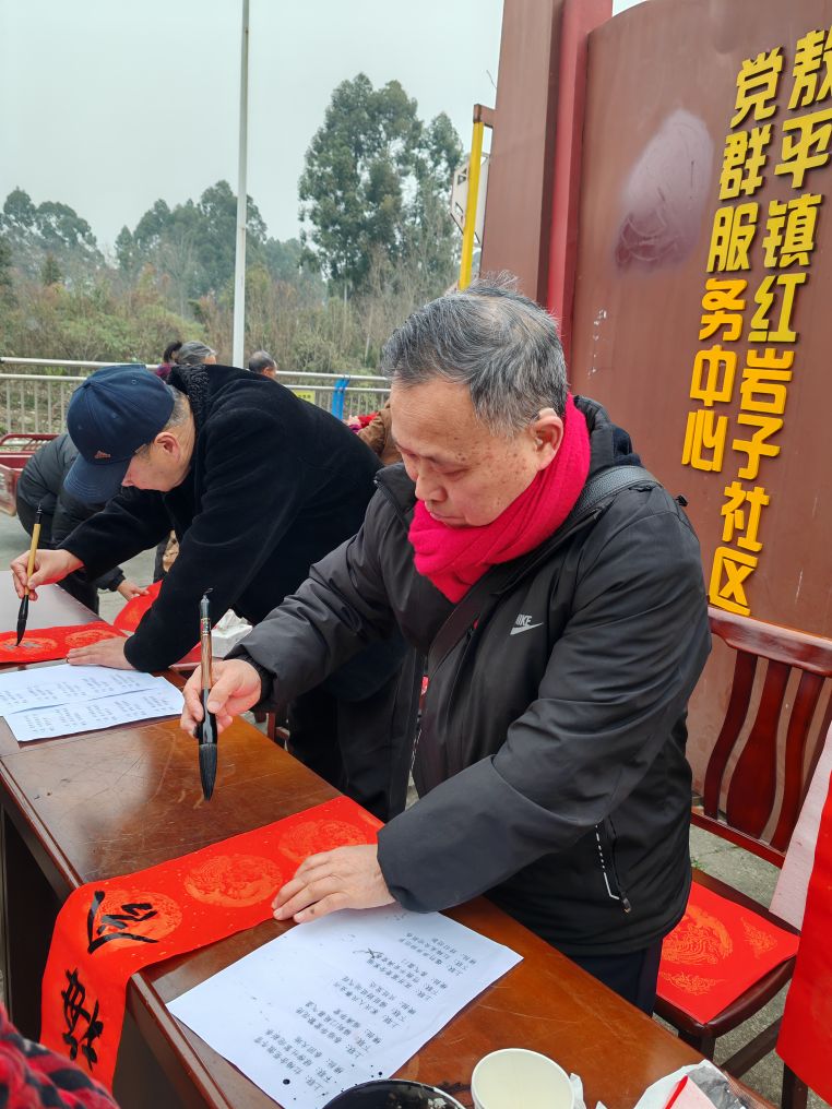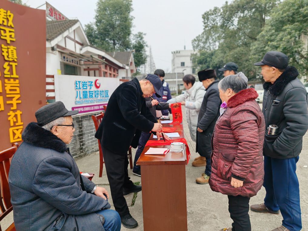 红岩子社区党委副书记纪委罗莎,副书记李廷军,社区党委居委会相关负责人,彭州市老科协办公室主任邹燕茹,敖平镇银龄志愿者服务队成员、蓉城金秋志愿者服务成员、政府退休党支部书记张国军,敖平镇老科协副会长舒治清,镇老科协秘书长丁穆松和镇政府退休党支部委员、志愿者刘汉平等也莅临现场指导,他们在现场与居民亲切互动,共同感受传统文化魅力。此次活动以笔墨为媒、以春联为礼,既为即将到来的马年春节增添了浓厚节日氛围,更搭建了文化惠民的连心桥,让基层群众在传统习俗中感受到党和政府的关怀与温暖。