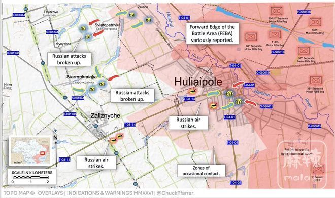 此前几天,乌克兰无人机攻击了一支正向胡利亚波尔行进的俄罗斯部队交火。视频分析显示,至少有4至5辆车辆被击中,同时有大量人员(根据卡车容量和散乱分布情况估计在50至80人之间)被击伤或严重致残。