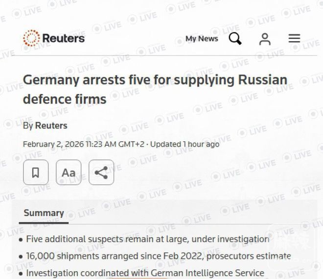 德国逮捕了五名向俄罗斯国防企业供应物资的人员。