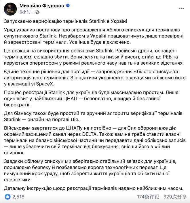 乌克兰国防部长费多罗夫宣布,乌克兰政府已通过一项决议,实施“白名单”政策,用于Starlink卫星终端的管理。以后,乌克兰(全境)将仅允许经过验证和注册的终端正常运行,其他未注册的终端将被关闭。
