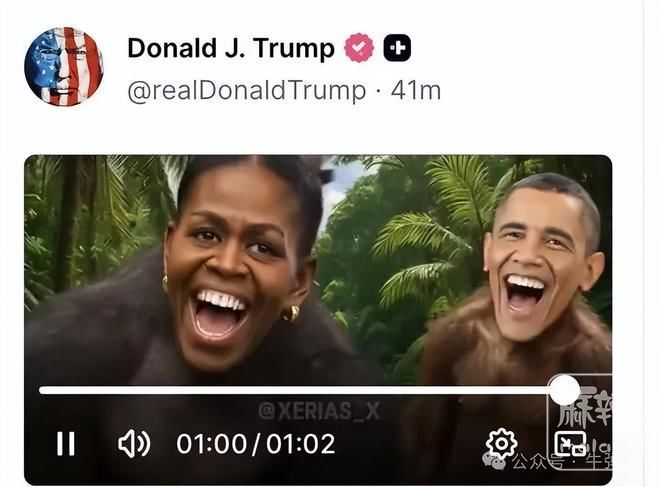 已经深夜11点多,特朗普在自己的社交账号上,发了一条短视频,视频中,美国前总统奥巴马和夫人米歇尔,变身成了两只大猩猩。