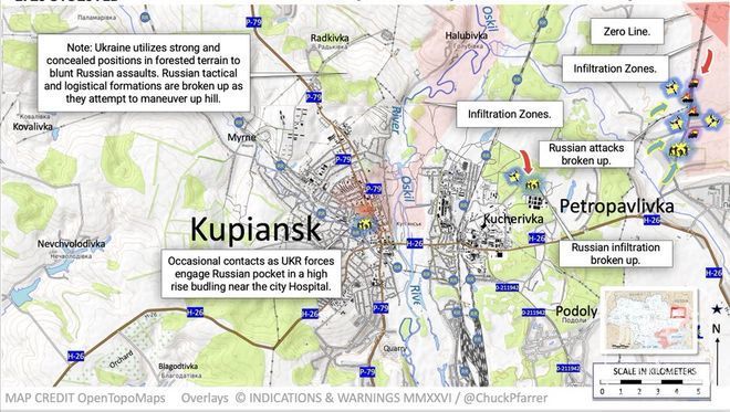 库皮扬斯克方向,乌克兰武装部队(主要来自联合部队集群,其中包括第43摩托化步枪旅的部队以及国民警卫队中的第2哈尔蒂亚军团等单位),正持续巩固城市地区,带地理定位的影像显示,乌军在市中心取得了一些虽属微小但确凿的进展——盘踞在高楼和居民区的俄罗斯小股部队被击溃,并确保了对更多街区以及位于市中心以北的霍卢比夫卡-库皮扬斯克公路的控制权。