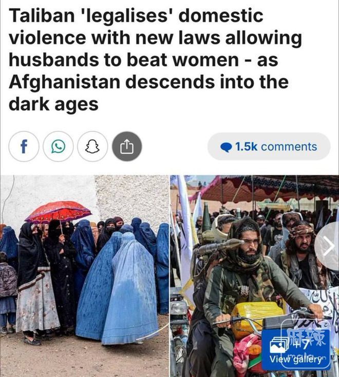 《每日邮报》报道称,塔利班允许男性殴打妻子,但禁止使用棍棒。只要不造成骨折或面部严重瘀伤,丈夫即可随意殴打妻子。若殴打行为极其严重,丈夫最高可面临15天监禁。