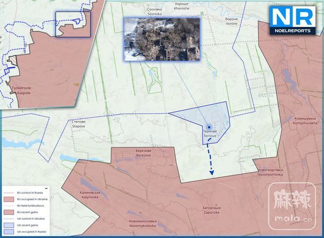 特尔诺韦村位于河流以南8公里处,此前完全处于俄军控制之下而非俄军插旗打卡那种灰色区域。