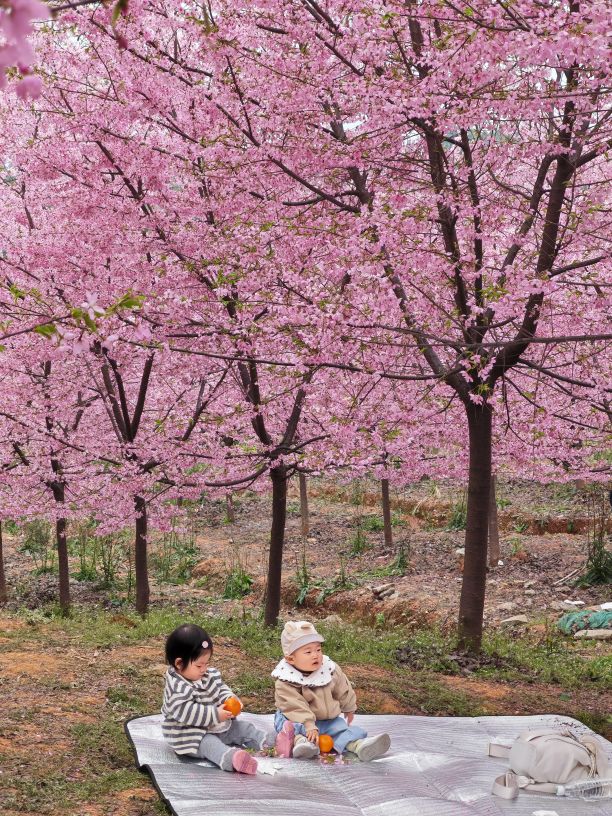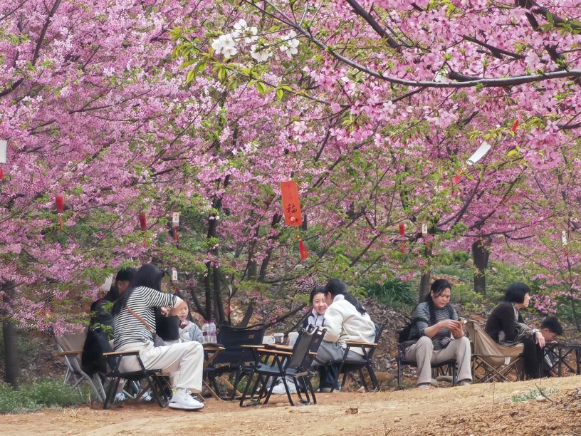 据了解,漫山樱花谷核心樱花林地超300亩,种植有2万余株红粉佳人樱花,搭配田间金黄油菜花,形成粉金相映的独特田园景观。景区内樱花树长势繁茂,花朵簇拥枝头,微风拂过,花瓣轻盈飘落,宛若浪漫樱花雨,移步易景,美不胜收。除了沉浸式赏花,景区还打造了彩色风车长廊、油纸伞打卡点等特色景观,配套围炉煮茶、野餐休闲、咖啡轻食等业态,丰富游客春日体验。