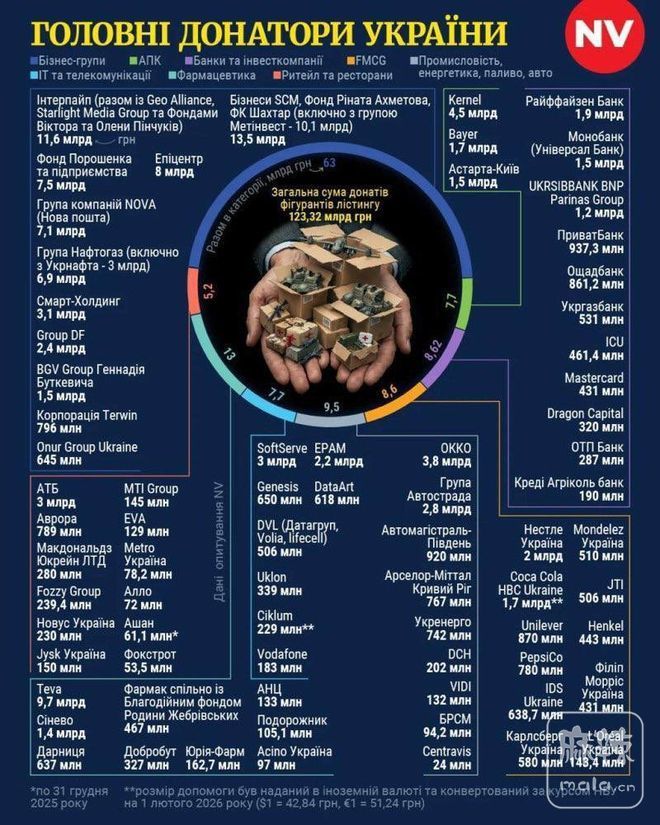 截至2025年12月31日,榜单上各公司提供的援助总额超过1230亿乌克兰格里夫纳。乌克兰前总统,反俄斗士兼巧克力大王波罗申科的表现还不错。。。