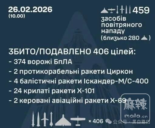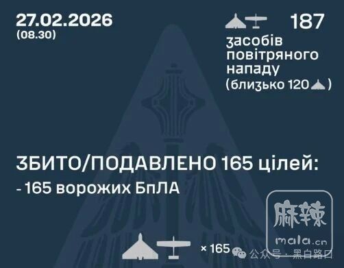 2月27日,俄罗斯发射187架无人机袭击乌克兰多地,乌军击落165架无人机,14个地点记录到撞击。