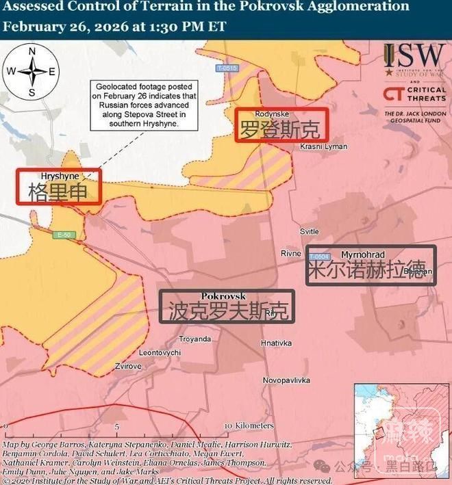 波克罗夫斯克方向,战争研究所(ISW)称,俄军已经占领波克罗夫斯克、米尔诺赫拉德,ISW评估依据是自1月下旬以来没有观察到乌军在该城的活动。