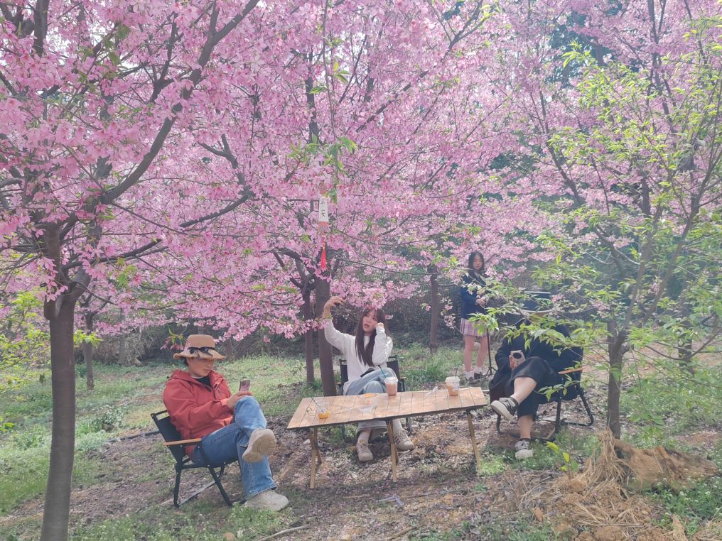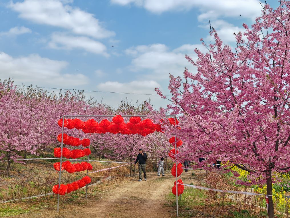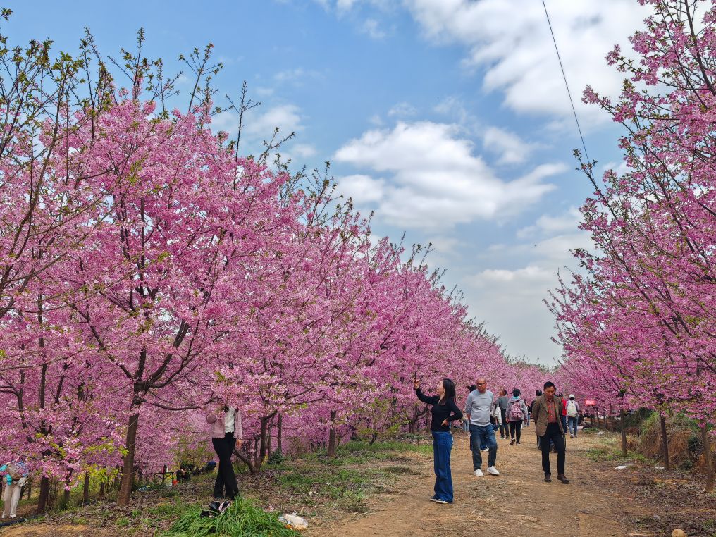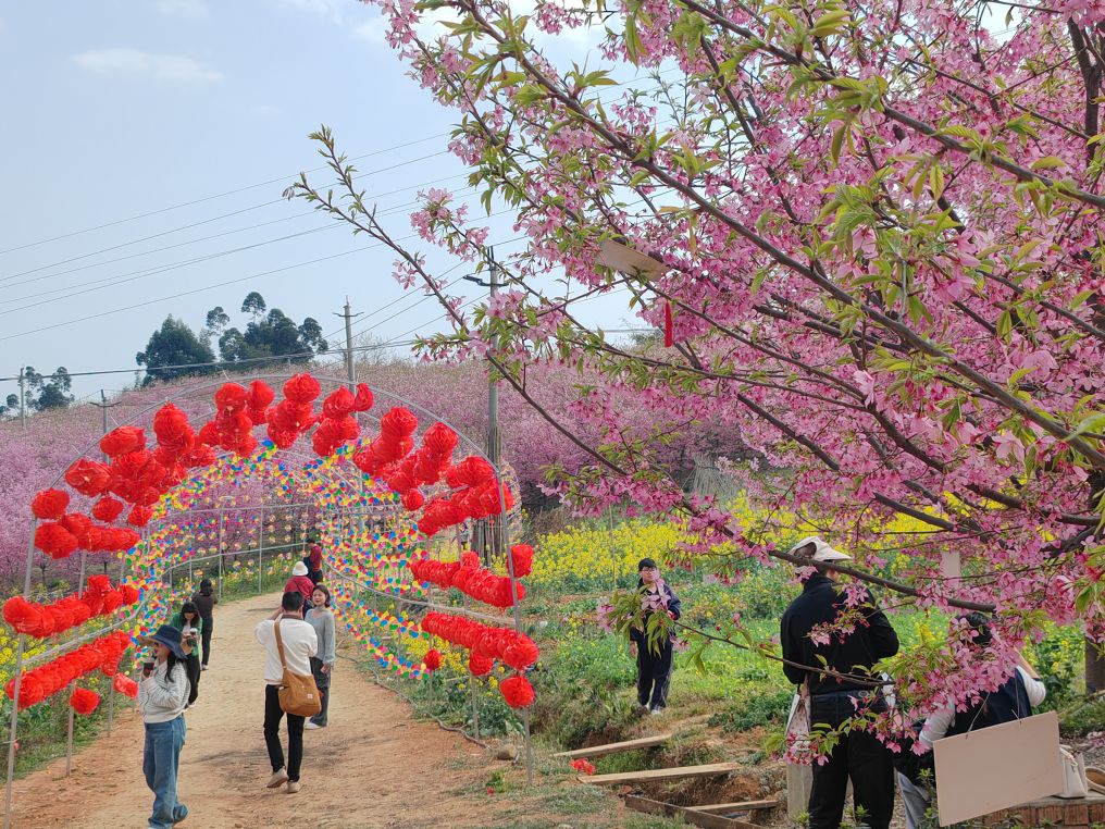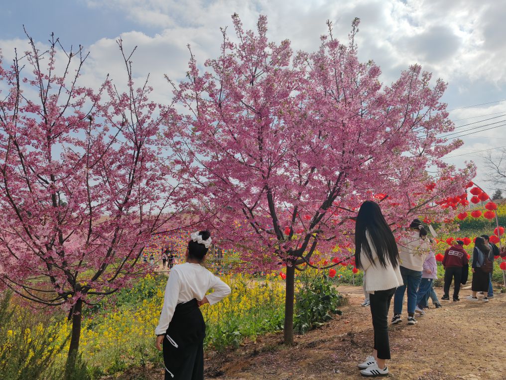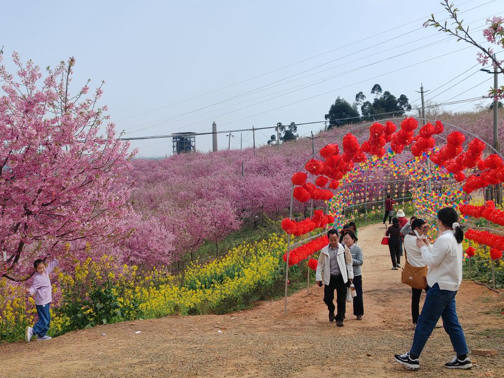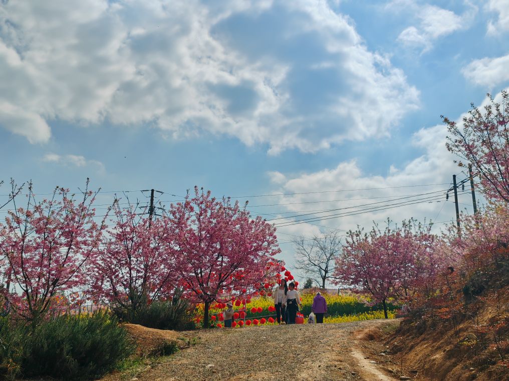 男女老少举着手机拍照、拍抖音,欢声笑语在山谷间回荡,处处是惬意与欢喜。这里虽是小众打卡地,却胜却无数知名景点。清新的空气沁人心脾,灿烂的樱花治愈人心。路边凉粉、烤肠的香气扑鼻,农舍饭馆挂着红灯笼,将诗意与烟火完美相融。