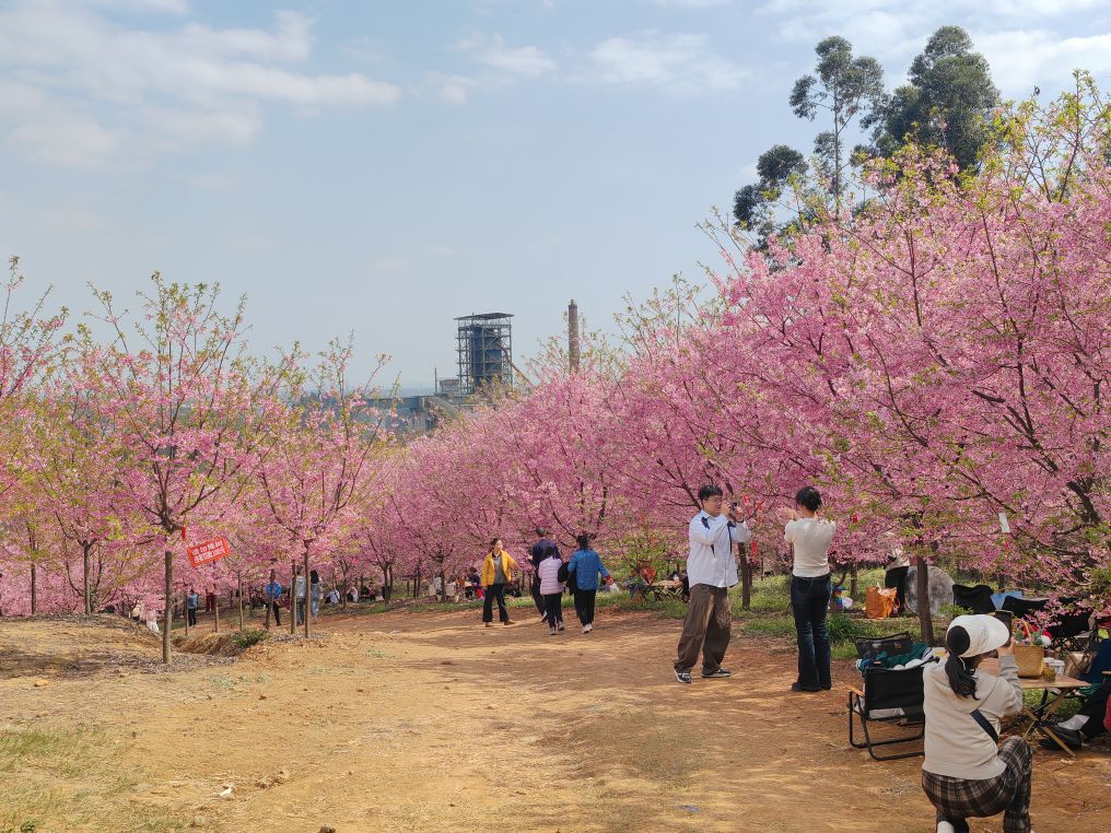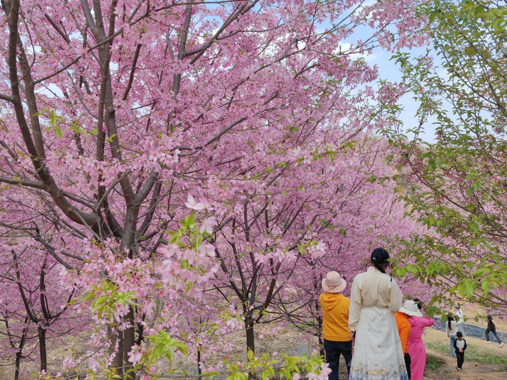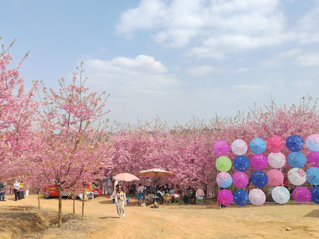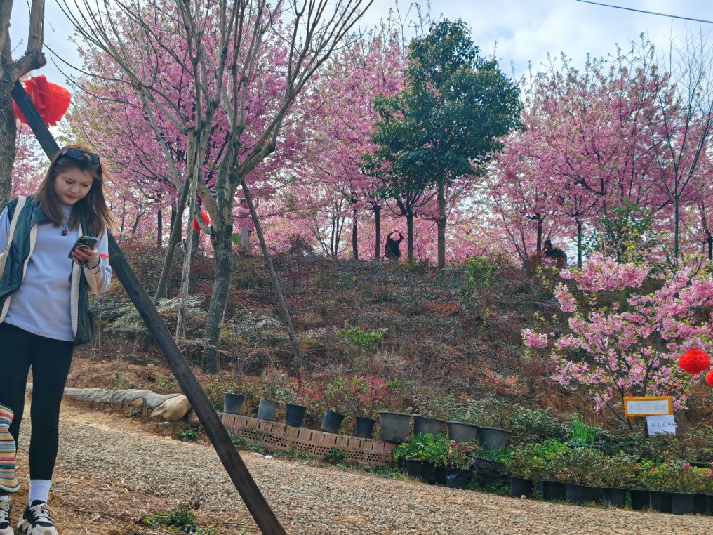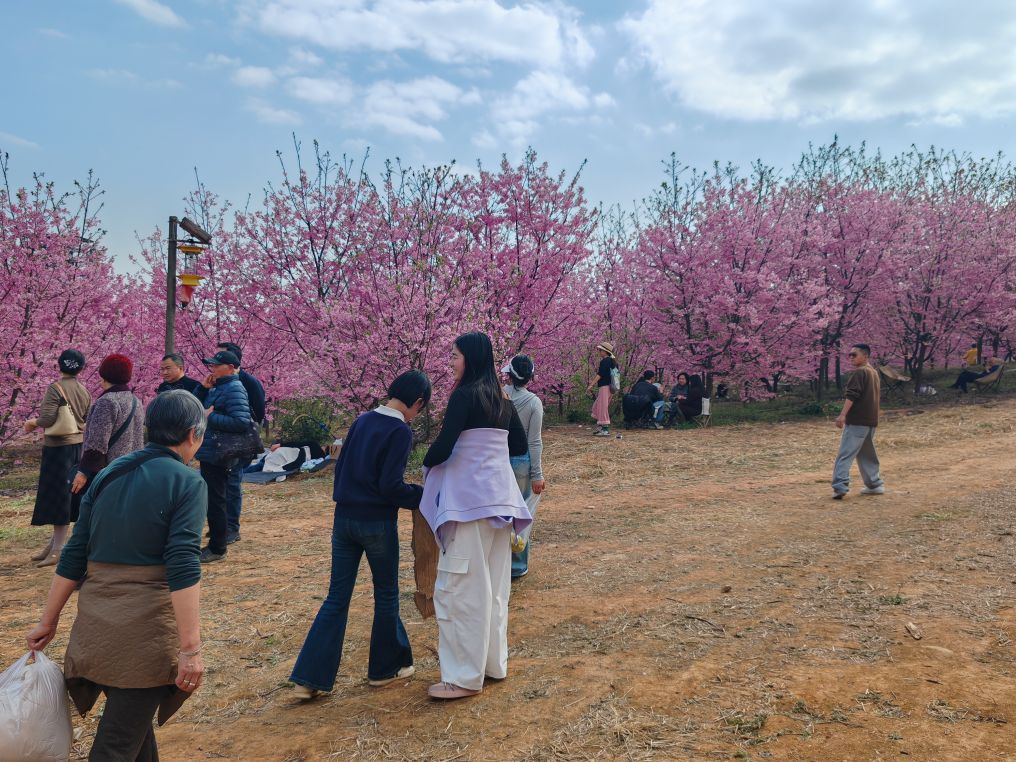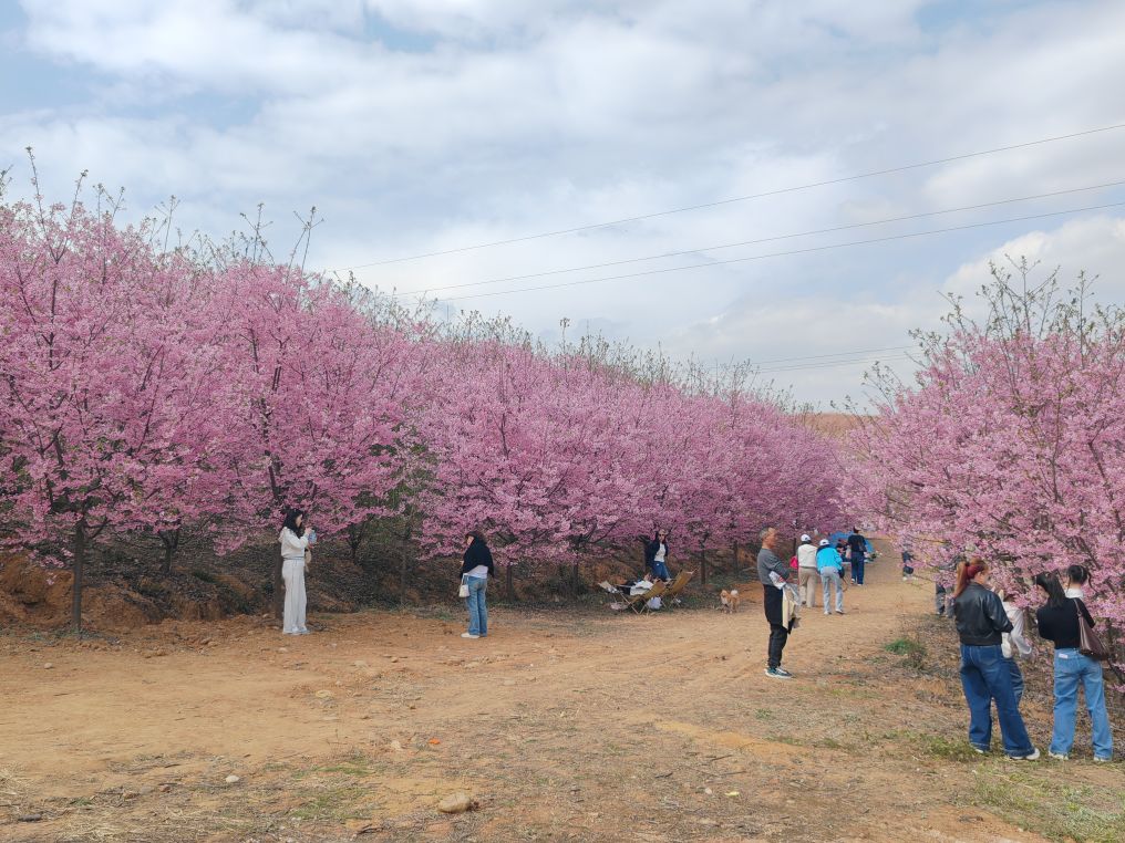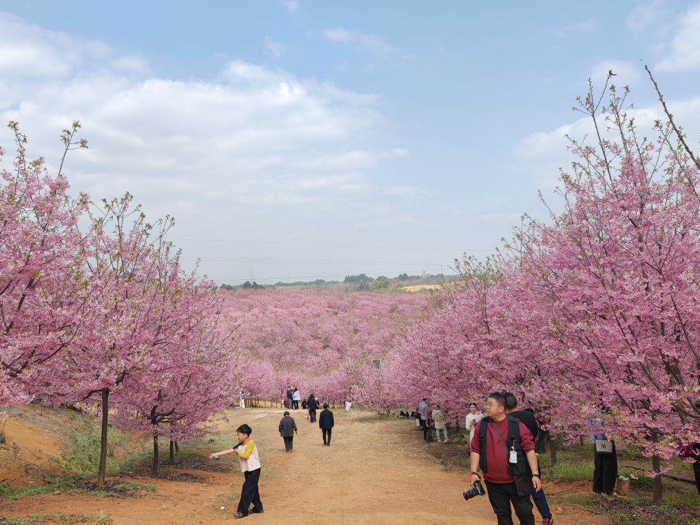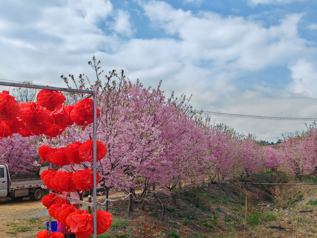 男女老少举着手机拍照、拍抖音,欢声笑语在山谷间回荡,处处是惬意与欢喜。这里虽是小众打卡地,却胜却无数知名景点。清新的空气沁人心脾,灿烂的樱花治愈人心。路边凉粉、烤肠的香气扑鼻,农舍饭馆挂着红灯笼,将诗意与烟火完美相融。