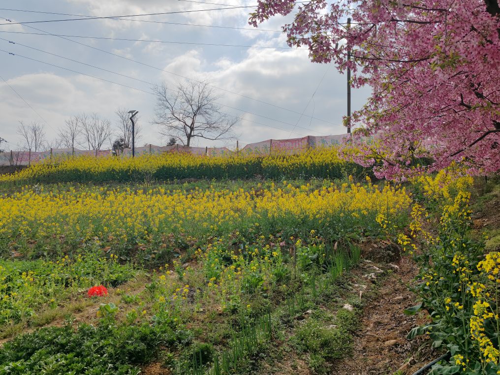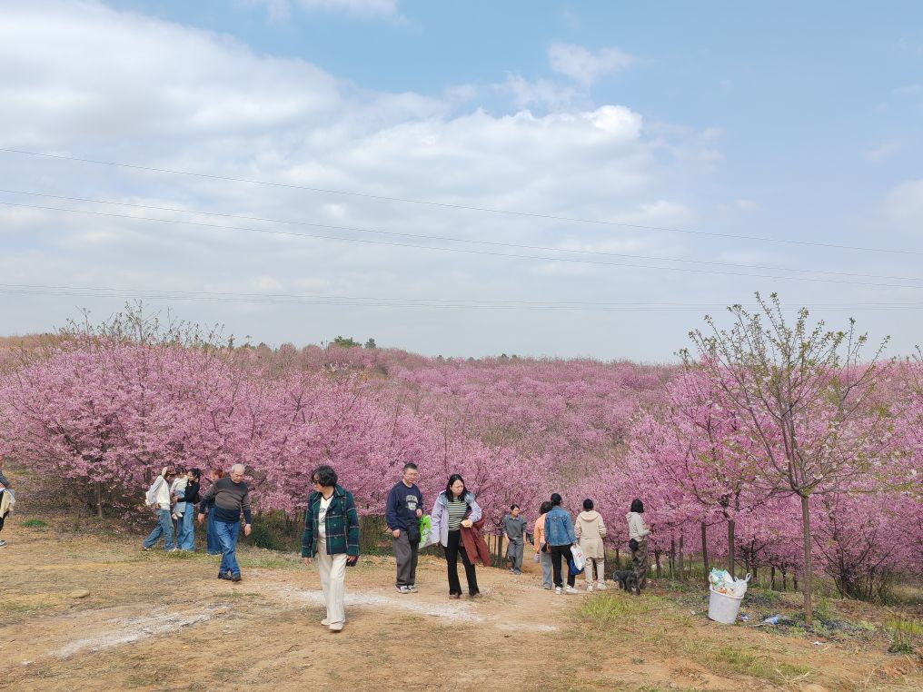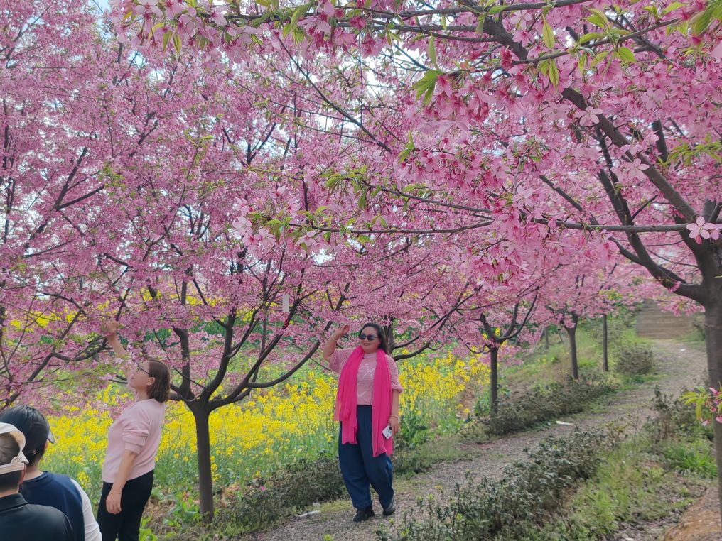谷中游人如织,扶老携幼的身影随处可见。花树林间,三三两两的人群席地而坐,一家人围坐谈天,好友结伴留影,孩童嬉笑打闹,身旁巴哥犬跟着主人在花径里撒欢,烟火气与花香交织。沿途金黄的油菜花、青翠的田垄相映成趣,与粉樱勾勒出最美的田园画卷。