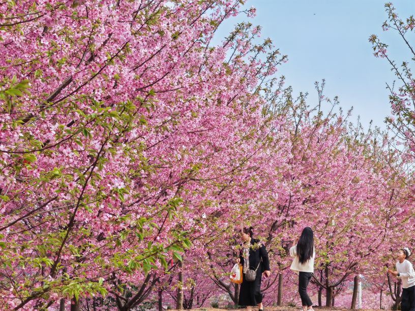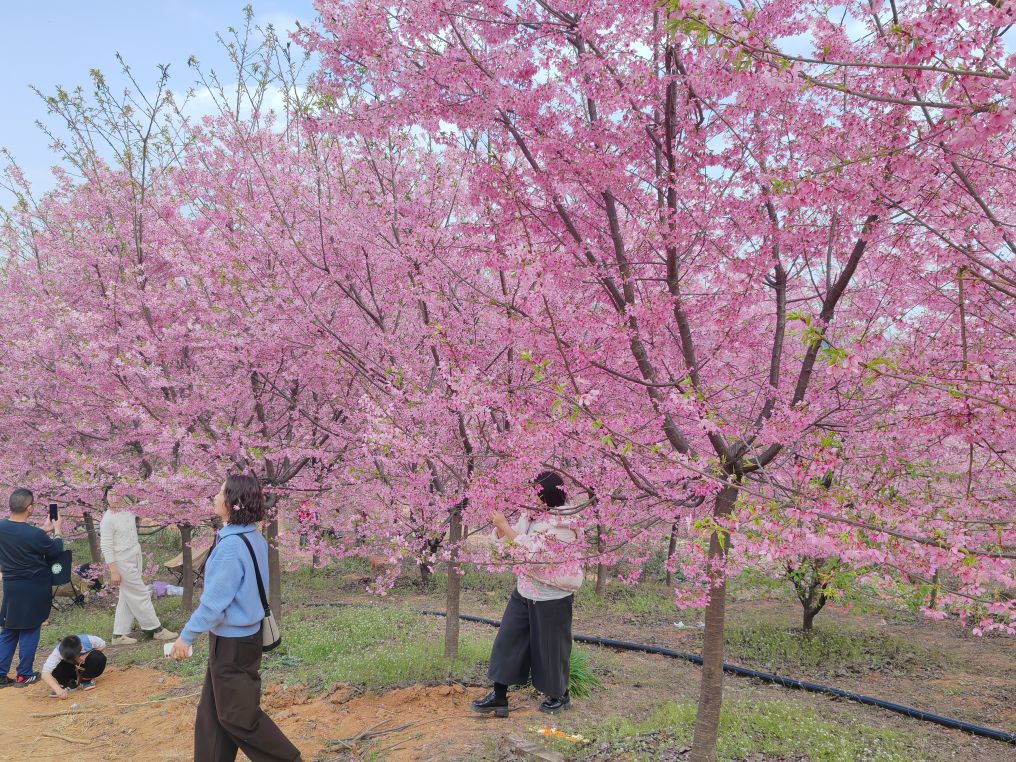 步入樱花谷,瞬间坠入无边的粉色海洋。粉樱顺着宽阔的山坡肆意怒放,坡上坡下繁花似锦,姹紫嫣红铺展成一片温柔云霞。碗口粗的樱树纵成行、横成列,整齐林立于游览小径与林荫之下,风拂花枝,粉瓣轻扬,连空气都裹着清甜的花香。