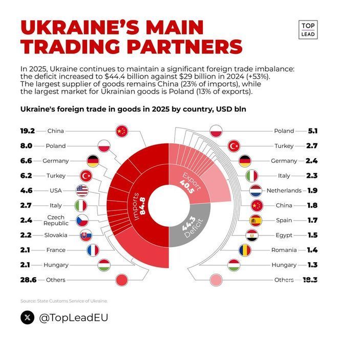 乌克兰持续面临显著的贸易逆差:2025年贸易逆差扩大至443亿美元,而2024年该数字为290亿美元。