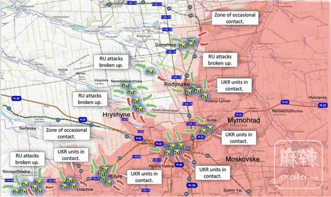 波克罗夫斯克方向,俄罗斯部队正保持着高强度的作战节奏,在M-32公路以南地区进行零散进攻。但到目前为止,多个攻击方向正被逐一瓦解,并未取得决定性的突破。