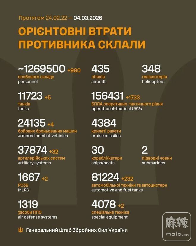 乌总参公布的昨日战果,歼敌(击毙+重伤)980人。