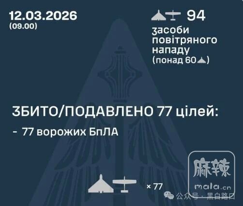 3月12日,俄罗斯发射94架无人机袭击乌克兰多地,乌军击落77架无人机,11个地点记录到撞击,1个地点有残骸落下。