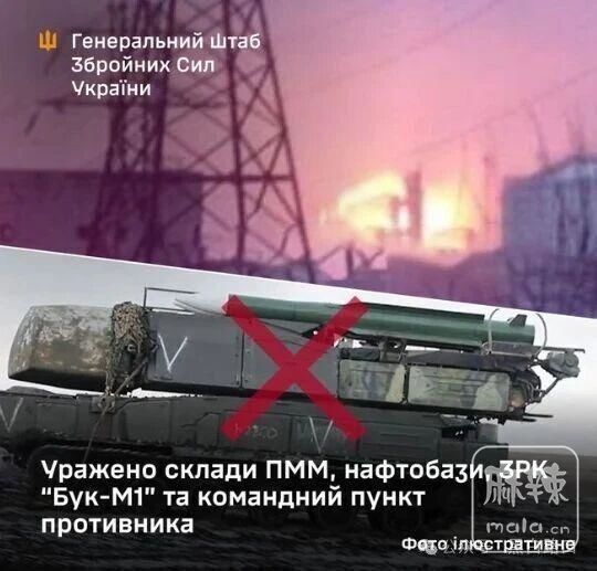 乌军还摧毁俄军“山毛榉”M1防空系统、步兵旅指挥所、弹药和后勤仓库、无人机库,以及燃料库和石油码头。