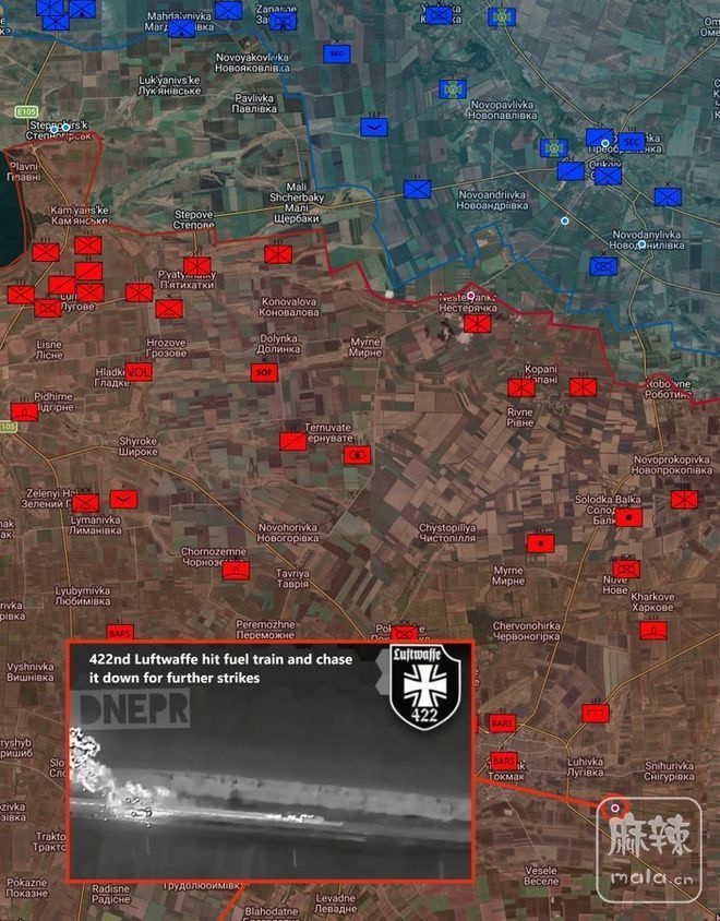 在另一边,乌克兰第422支空军部队袭击了一列位于托马克以东的俄罗斯燃料列车机车,随后在其试图逃脱时对其进行追击,并最终在特廖茨克附近将其击毁。
