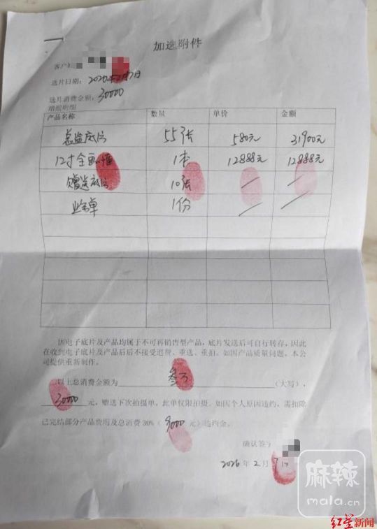 小李提供的一份与上述摄影公司的业务单显示,其购买的产品为总监底片55张,单价为580元;12寸全画框一本,单价为12888元;赠送底片10张,总消费金额30000元。该张业务单上还称,“因电子底片及产品均属于不可再销售型产品,底片发送后可自行转存,因此在收到电子底片及产品后不接受退费、重选、重拍。”