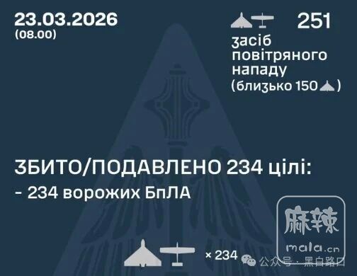 3月23日,俄罗斯发射251架无人机袭击乌克兰多地,乌军击落234架无人机,11个地点记录到撞击,8个地点有残骸落下。